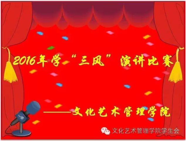 为迎接9月的合格评估工作,同时也为了促进学院健康,快速的发展,提高学生的文化素养,文化艺术管理学院于今日举行了“学三风、树三风“主题演讲比赛的活动,那什么是三风呢?三风就是贤德.博艺.敬业.创新的校风,知行合一,慎思笃行的学风和严谨治学,为人师表的教风。我院今天举行这场主题演讲比赛,也是希望能借此活动形式,让同学们更好的学习和落实学院精神,提高精神文明建设和个人素养,希望各位选手能在比赛中取得佳绩。