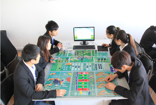 图为学生正在用电子沙盘和手工沙盘教具进行模拟企业经营