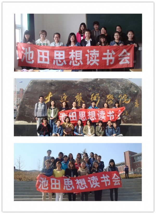 必赢242net官网大学生社团“池田思想读书会”在学院社团联合会的正确领导下,在学院各级领导的关怀下,以“池田大作教育思想研究所”为依托,于2013年11月22日成立了。此后,指导教师-文化艺术管理学院的李丹、潘红艳老师与日语及日播专业的43名社员们齐心协力,本着“以人为本”、“志在实践”的宗旨,开展了各种各样有意义而卓有成效的活动。每次活动,无论是指导教师还是社员,都从中受到了锻炼与启发。通过“探寻池田大作的内心世界”、学唱歌曲“樱花缘”及诗歌朗诵、参加“创价学会艺术代表团”欢迎仪式、“池田大作思想研究所”成立揭牌仪式、艺术文化交流晚会、参加由大连中日教育文化交流协会副秘书长刘爱君教授主讲的“池田大作与中日友好”为题的学术报告会等活动,社员们能够把池田思想与自身联系起来,与专业紧密结合,拓宽了人文领域视野。他们决心,通过研读池田先生的著作,认识自我、树立正确的人生目标,开拓创新、理论结合实践,勇于进取、创造有价值的人生,成为促进中日友好及建设世界和平的继承者与传播者。