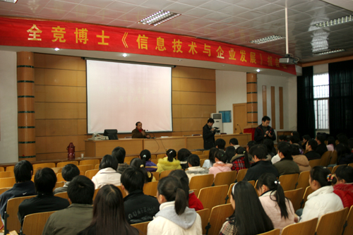 “今天是2008年的第一个工作日,回到家乡感到格外亲切”,全竞博士一脸激动的倒出了思乡之情。全竞博士首先向大家介绍了自己的成长经历。他毕业于十堰市一中,人生的第一个转变是1979年考上武汉大学计算机科学专业,1986年获武汉大学工商管理硕士学位。人生的第二个转变是当时中美经济管理的学习交流,国家教育部在全国抽取50名专家赴美学习,全博士自信微笑的说:“我幸运的成为其中之一”。1990年获得美国弗罗里达大学哲学博士学位,1998年取得微软系统工程师、训练师证书,曾经在世界银行工作。全博士与北京大学深圳学院、东北财经大学曾开展过合作,在信息技术和商业运作方面有着丰富的理论知识和实践经验。
