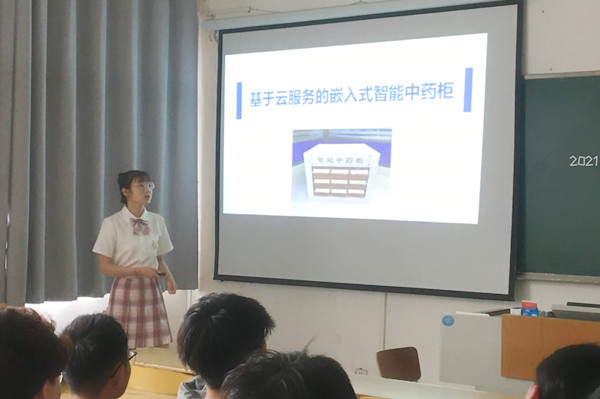 两名参赛同学分别作了交流发言。邱丹瑞同学从行业背景、中药柜痛点、系统架构、设计亮点等方面对“智能中药柜”进行了讲解。边昊同学通过视频展示了“智能中药柜”的使用过程和细节,并演示、解说了软件部分的应用系统操作过程。