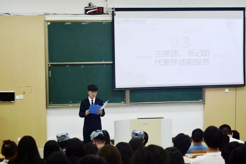 在工作回顾环节,2023级学生会主席团代表蹇亿、书记团代表王维先后进行述职报告。他们全面梳理过去一年的工作成果,从丰富多样的校园活动组织、细致入微的学生服务工作,到规范高效的日常管理、富有成效的团队建设,每一项成绩都凝聚着过往成员的辛勤付出与不懈努力,也为新一届学生会成员树立了奋进目标。