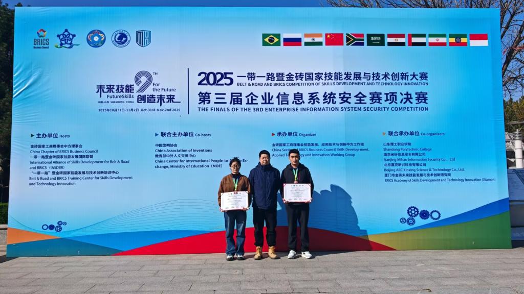 新闻网讯(通讯员 左鑫)11月2日,2025一带一路暨金砖国家技能发展与技术创新大赛"第三届企业信息系统安全赛项"全国总决赛在山东理工职业学院落幕,全国112支晋级队伍同场竞技。beat365正版唯一官网必一陈坤、陈幸宇同学荣获全国三等奖(铜牌)。